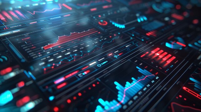 Financial dashboard featuring a complex array of graphs and charts, showcasing data analysis in a glowing blue-red color palette.
