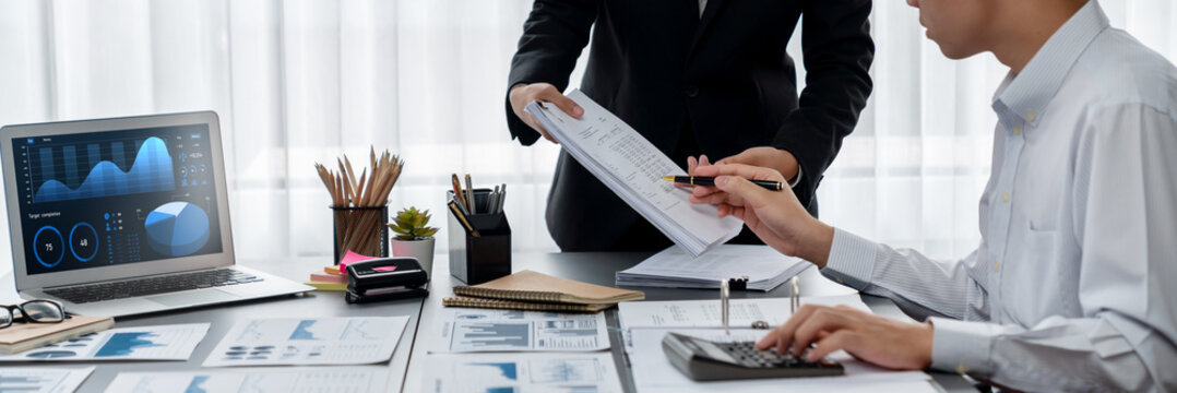 Auditor team collaborate in office, analyzing financial BI data dashboard on laptop screen and accounting record. Finance and taxation with accurate report and planning for company budget. Insight
