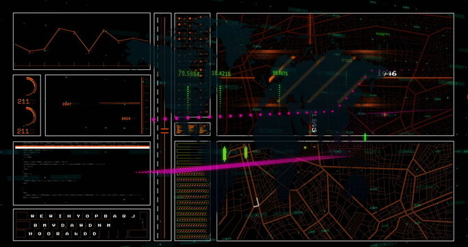 Displaying futuristic data hud with cyan magenta ringed arcs, global map, financial charts