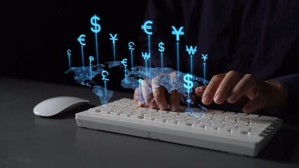 Currency exchange and international money transfer concept. Businessman searching virtual global currency exchange, foreign currency, international money transfer, financial online banking payment