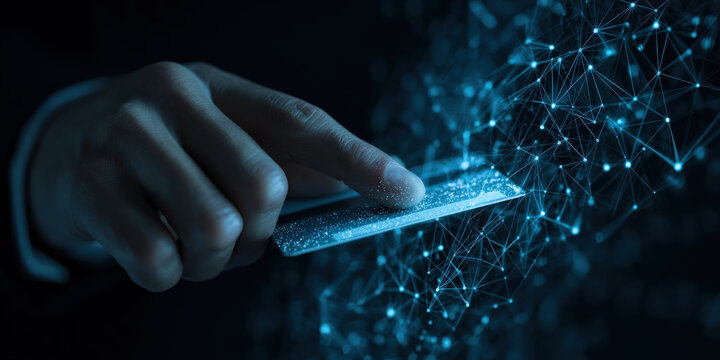 Hand holding credit card is surrounded by digital network, symbolizing secure online transactions and digital payments. image conveys sense of modern technology and cybersecurity