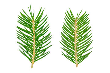 Two green spruce fir needles isolated, closeup of evergreen pine foliage for Christmas decoration