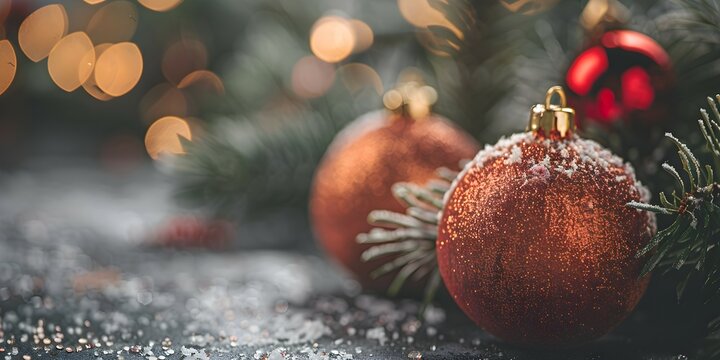 Festive red ornament decor on evergreen christmas tree branch
