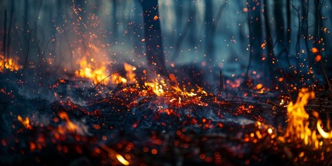 Intense close-up of a forest ground fire with scattered embers and rising smoke.