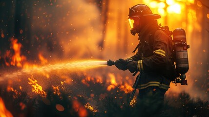 Firefighter holding a fire hose with water in his hands, extinguishing a fire