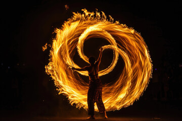 Long exposure photography of a fire poi artist creating circular light trails in the dark. Performer spinning burning equipment at night.