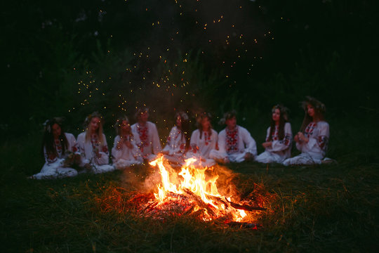 Midsummer night. Young people in Slavic clothes sitting near the bonfire.