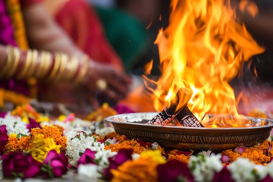 Traditional fire ritual with flowers.
