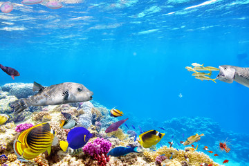 Nemateleotris decora, the elegant firefish or purple firefish goby,  a species of dart fish   is swimming over Corals of Bali