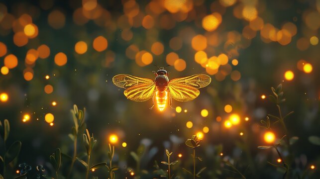Abstract and magical image of Firefly flying in the night forest. Fairy tale concept.