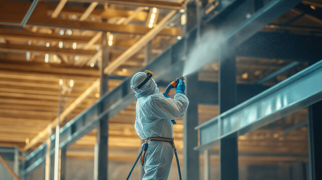 Specialist in protective suit spraying fireproof coating on steel beams inside a new building - Safety-focused and proactive, natural light
