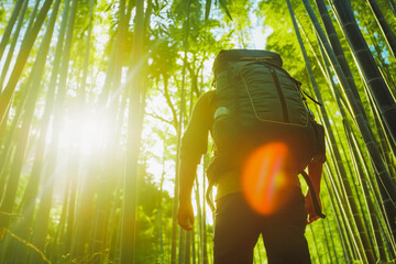 A man hiking through a bamboo forest, sunlight filtering through the stalks, backlit by the sun.