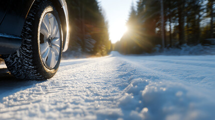 A close-up of a car tire on a snowy road with sunlight filtering through trees, highlighting winter driving conditions and icy textures on the surface