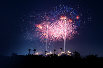 Firework display festival ..The most famous firework Pra Nakorn Kiri festival in petchaburi Thailand with palm tree silhouette in foreground and three pagodas on the hill in background..