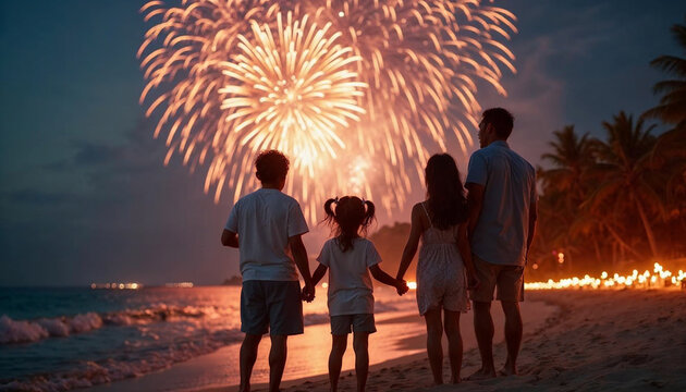 Parents and children of celebrating New Year 2025 on a tropical beach, joyfully watching a spectacular firework display