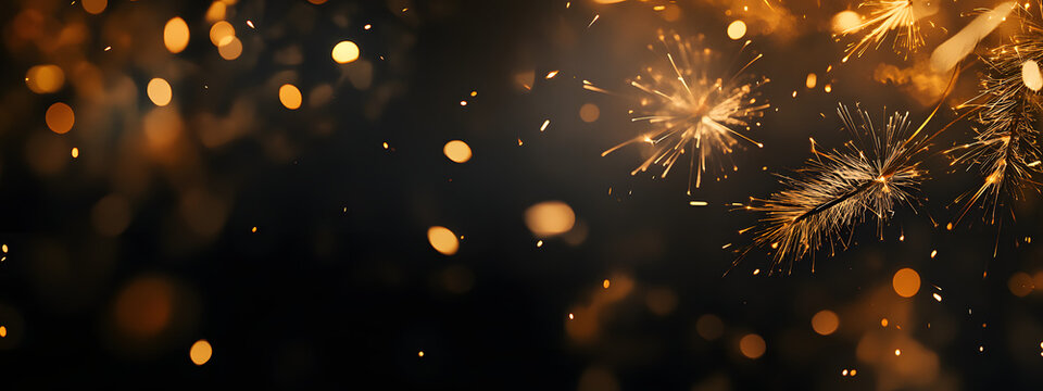 Beautiful sparkling celebration background with golden bokeh and fireworks effect