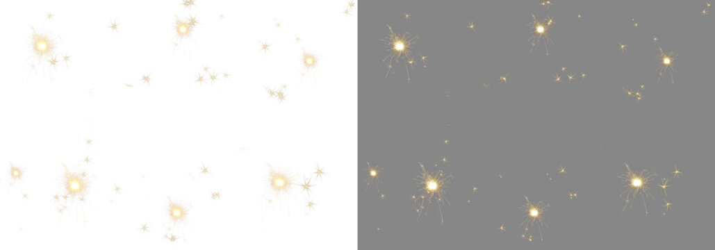 Golden fireworks bursting, generating luminous light trails against transparent background, symbolizing celebration and festivity