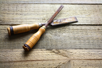 Old used flat chisel with red and black plastic handle and dirty metal blade, isolated on a white background. Carpenter or joiner hand cutting tool. Closeup. Copy space