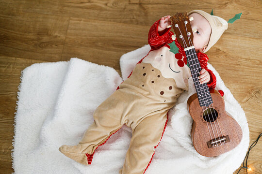Cute baby in sweet christmas costume holding guitar and lying with christmas lights on floor, top view. Baby's first christmas. Merry Christmas and Happy Holidays!
