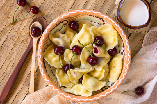 Preparing dumplings with cherry. making pierogi or pyrohy, varenyky, vareniki. Traditional Russian cuisine, The traditional Ukrainian handmade vareniki (dumpling) with cherry inside