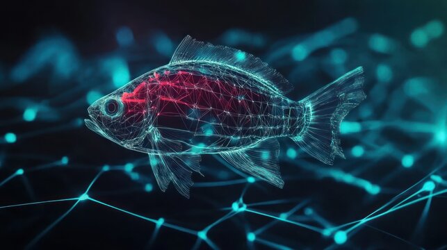 Abstract digital fish model with glowing lines and nodes.