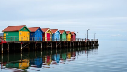 a row of colorful fishing huts along the pier, reflected in the calm sea water.