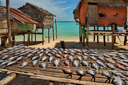 Malaysia. A reef island on the East coast of Borneo. A catch of sea fish dries in the sun in a fishing village of sea Gypsies.