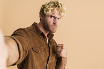 Furious woman wants to fight, clenching her fists in an aggressive pose