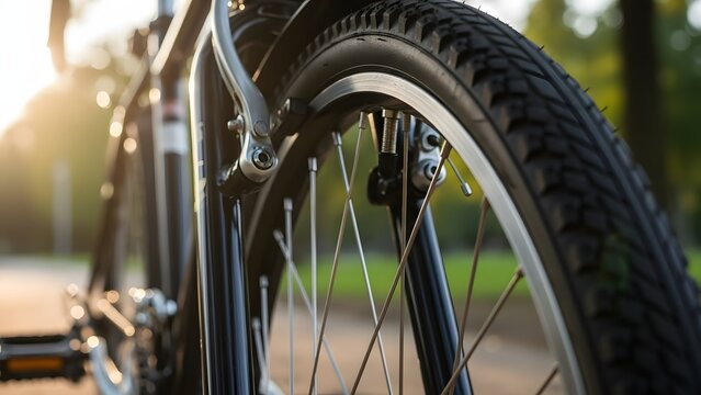Close-up of a bicycle wheel on a sunny day, showcasing the tire, spokes, and brake caliper