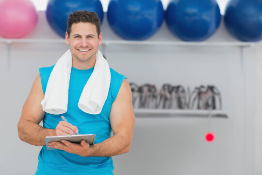 Male fitness instructor taking notes on clipboard with pen while wearing towel in fitness studio