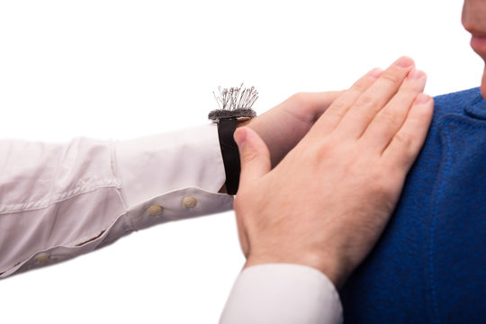 male tailor designer make marks on a jacket during bespoke suit fitting