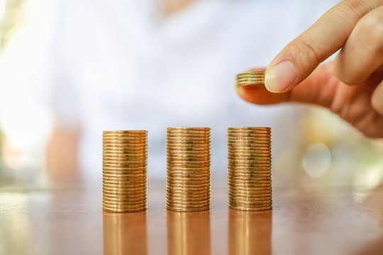 Business, Money, Finance, Saving and Secure Concept. Close up of man hand holding and put four coins to stack of coins on wooden table.