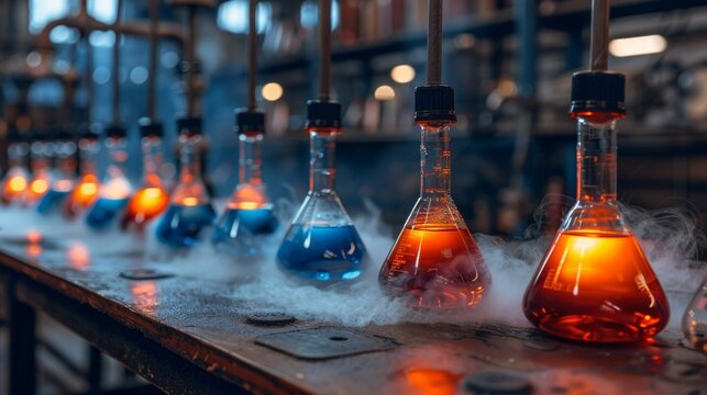 Chemical reactions taking place in a laboratory setting, with colorful liquids bubbling and fizzing in glassware.