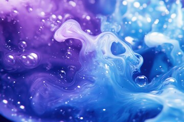 Glistening orbs of gel. Viscous spheres. Ink combined with fluid. Vivid blue and purple fizzing paint circles blurring in motion creating a captivating abstract backdrop