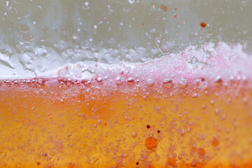 Macro photo of colourful children's experiment using oil, water, food colouring and fizzing tablet seen through clear glass