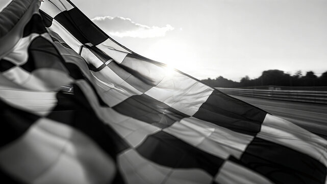 Black and white checkered flag waving in the sunlight at a racetrack finish line