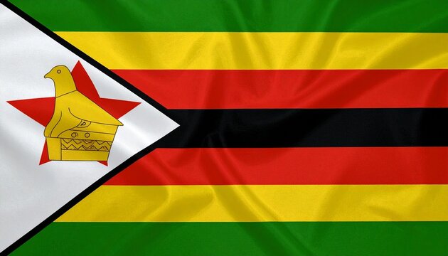 Zimbabwe national flag with seven horizontal stripes (green, gold, red, black), white triangle with red star and yellow Zimbabwe Bird.