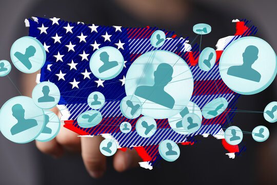 Visual representation of social connections within the United States. Network map overlayed on US flag.