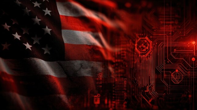 A digital representation blending the American flag with circuit patterns, showcasing a fusion of patriotism and technology in bold red tones.