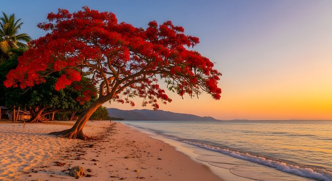 A solitary flamboyant tree with brilliant red blossoms on a sandy tropical beach at golden hour sunset.