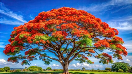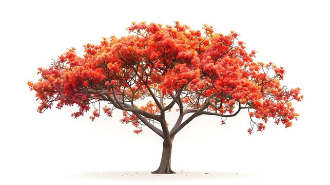 A flamboyant flame tree with vivid red-orange blooms on a white background.