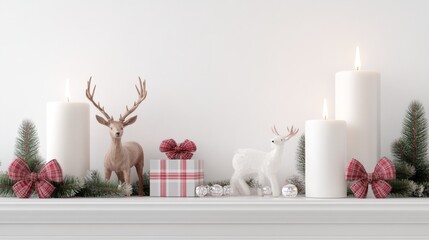 2408_092.Cozy Christmas mantel decorated with rustic deer figurines, plaid bows, flameless candles, white background, 3D Rendering, isometric