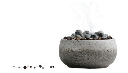 Small, gray ceramic bowl with rocks, emitting white smoke