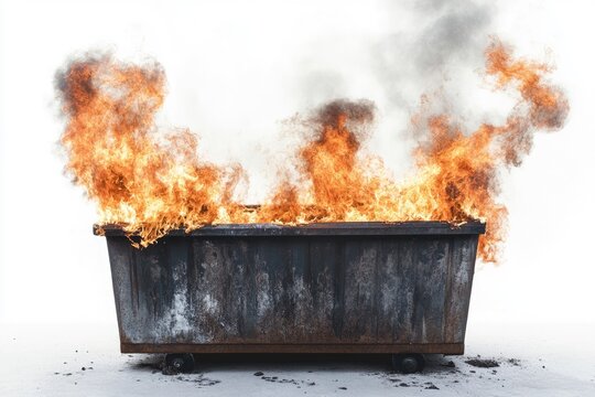 Burning Trash Can: A green trash can engulfed in flames with papers inside, backyard setting.