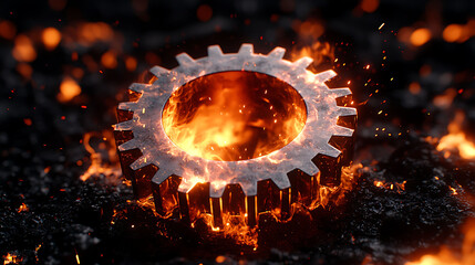 Fiery metal gear engulfed in flames on dark background.  Dramatic, intense imagery ideal for concepts of power, industry, innovation, and highperformance.