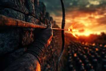 A lone archer aims a flaming arrow with precision from atop a fortress wall, as the blaze of the setting sun casts dramatic shadows over the battlefield below.