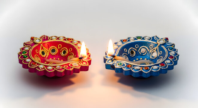 Two decorative diyas with flames on a white surface, one red and one blue, casting soft shadows