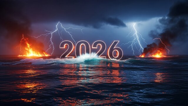Fiery numbers 2026 rise from ocean waves with lightning strikes in a stormy sky.