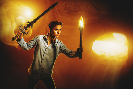 Heroic Silhouetted Knight Wielding Flaming Sword Amid Fiery Background