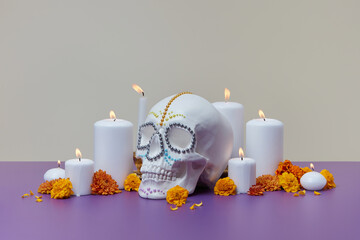Skull with candles, beads and flowers